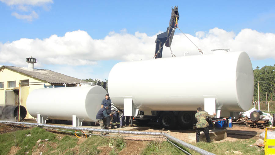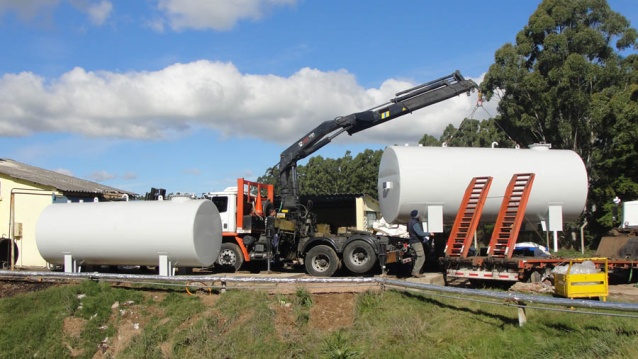 Suministro y montaje de 3 tanques aéreos para combustible, 2 de 15m3 y 1 de 25m3 de capacidad, junto a las bases, bombas y surtidores de combustible correspondientes. Fabricados según norma UL142.